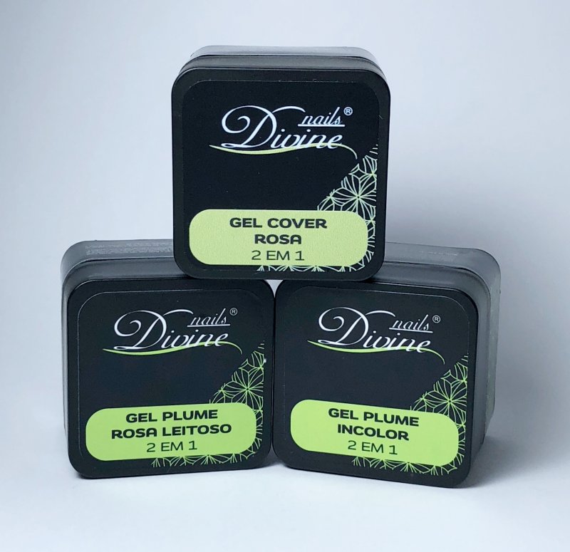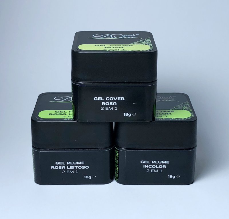 Pack constituido por Gel Plume Incolor 18 gr, Gel Plume Rosa Leitoso 18 gr e Gel Cover Rosa 18 gr .